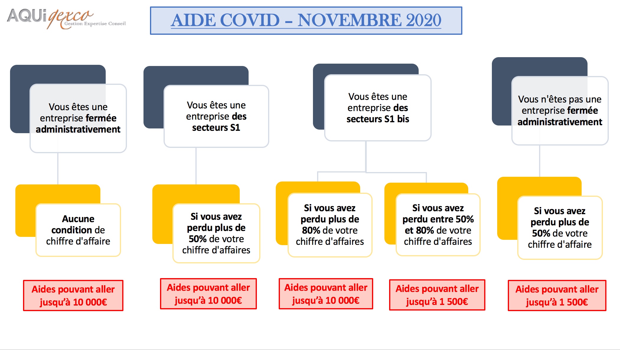 Voici en résumé l’application du fonds de solidarité pour le mois de novembre 2020 suite au décret en date du 2 novembre 2020. (cliquer sur l’image)